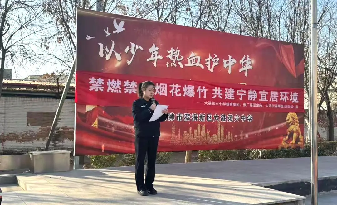 大港第六中学联合板厂路派出所、大港街道春晖里社区,以升旗仪式为载体开展禁燃禁放烟花爆竹主题宣传活动。学校法治副校长李警官以新修订的治安管理处罚法为切入点,一方面剖析违规燃放的法律后果及环境危害,另一方面强调打架斗殴、故意挑衅等行为的违法成本,引导学生树立“言行有边界,安全无小事”的法治意识。